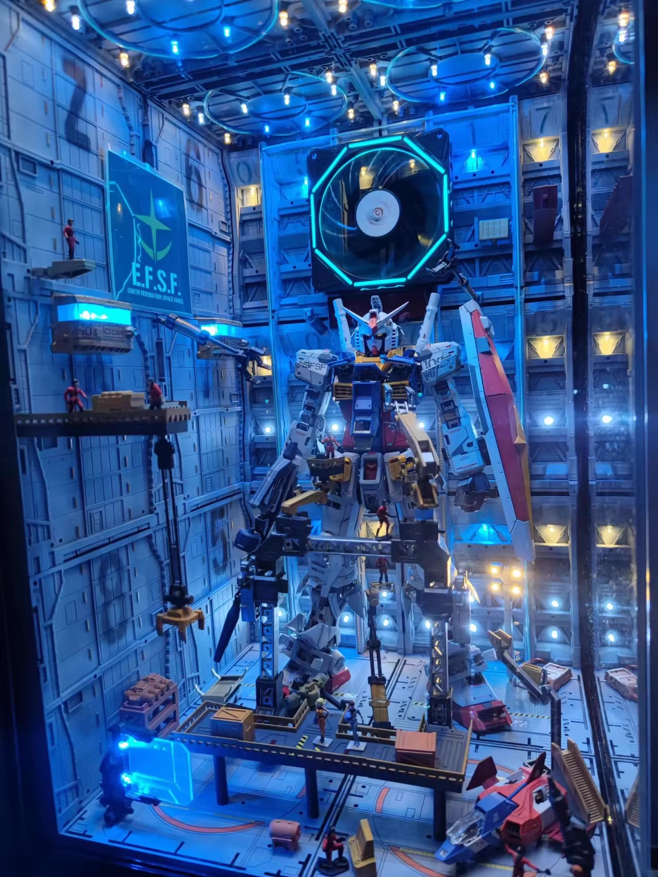 Gundam Model Metal Structure Nu & Sazabi or other model kit hangar. Mainly dark gray with metallic accents, matte finish with decals, enclosed corridor, military flags, EL wire, fans, spotlights, scrolling LED display, fully enclosed acrylic panel.